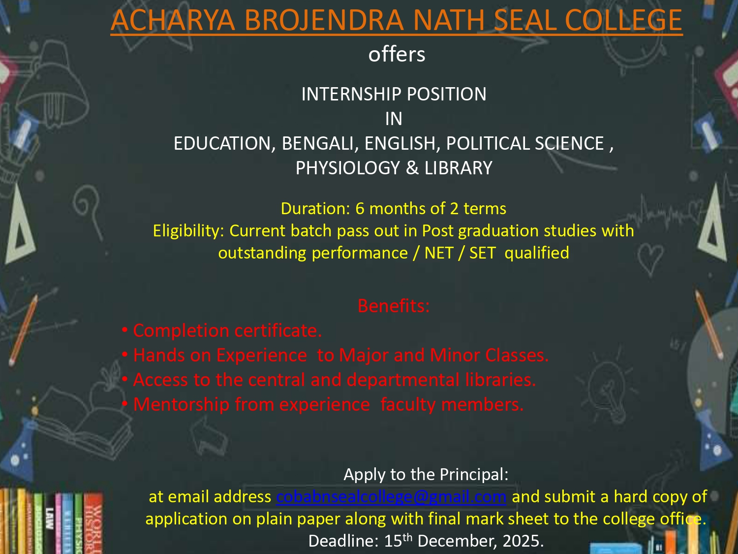 Greetings and blessings for your journey to higher education. A. B. N. Seal College awaits to welcome you in its very own family. Ours is the only Government General Degree College in the district fostering the educational excellence since 1888, having a magnificent community of alumni from remote past to recent times. Apart from the curriculum, you will enjoy the campus life to the fullest along with equipping yourselves for the career path ahead. The more you explore and engage with us, the more we will be able to open a world of possibilities to you. Dedication, Determination and Discipline are the components within you to excel with social responsibilities and ethics.
